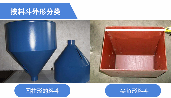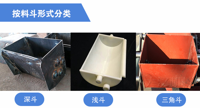 料斗型式如分為:淺斗、深斗和三角形斗。淺斗:斗口與后壁夾角小,可裝的物料少,但卸料容易。適用于運送潮濕、粘性等流動性差的物料如:水泥、濕砂、石膏粉等。深料斗和淺料斗多由鋼板焊接或直接沖壓而成,也可用可鍛鑄鐵鑄造而成,為減輕料斗自重,還可采用玻璃鋼制成。