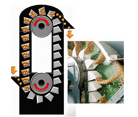 利用離心力將物料甩出卸料口。適用于提升速度快、干燥、小顆粒的場合。料斗的速度比較高,一般為每米1-2秒,要保持這個速度,必須選擇正確的驅動輪,速度和直徑尤為重要,卸料口的選擇不容忽視。
