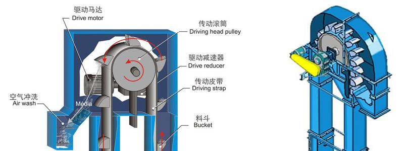 優點:在相同料斗速度下,驅動輪尺寸小,卸料位置高,各料斗間距減小,可增加卸料管高度,機器高度降低。