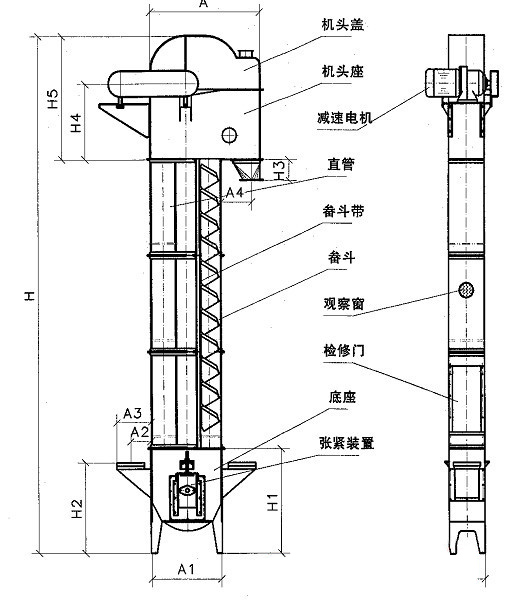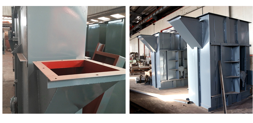 斗式提升機(jī)由上部區(qū)段、中部機(jī)殼、下部區(qū)段、帶料斗的輸送帶等牽引部件、傳動(dòng)裝置和室外檢修平臺(tái)組成。